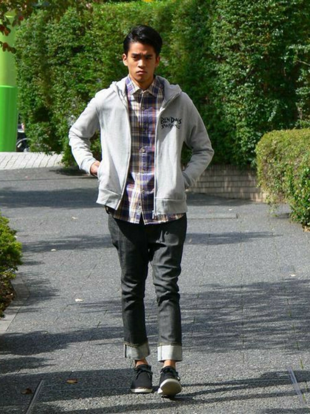 厚手のネルシャツにジップパーカーをアウター替わりに羽織ったカジュアルなスタイル。温度調節が効くので昼夜の気温差がある今の季節におススメなコーディネート。