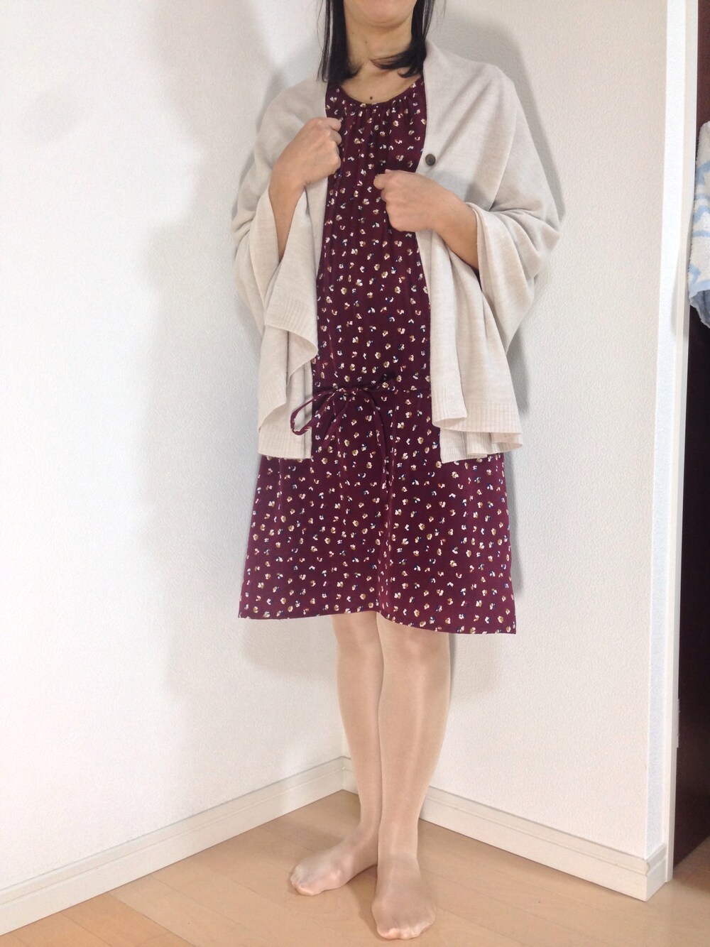 2年ほど前に購入した、ハニーズの小花柄ワンピース!つるんとした記事が着やすくて秋らしいカラーが気に入ってます! 寒い時は、ストールをプラス。