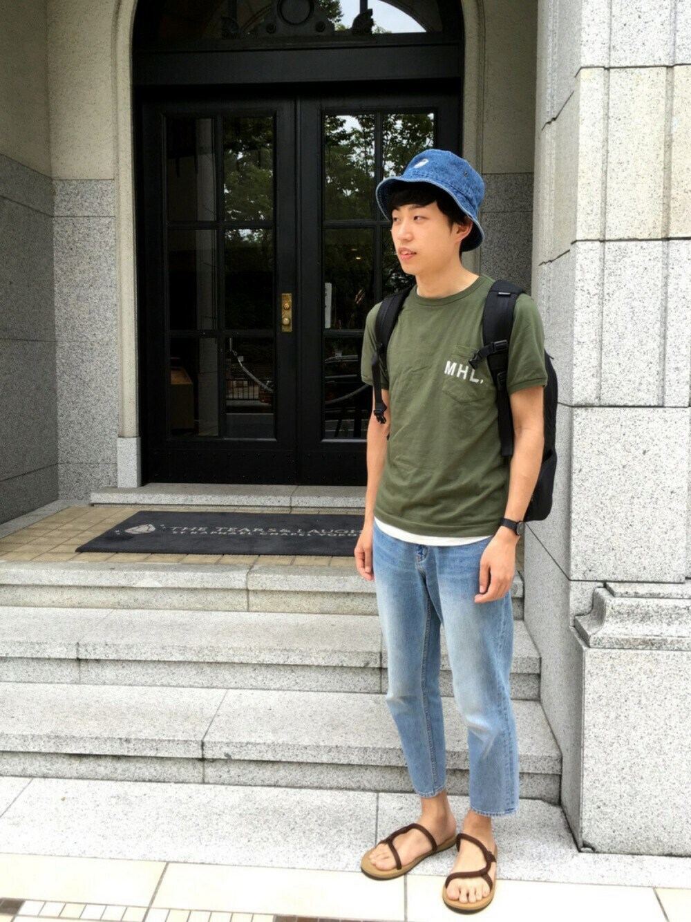 遠出中なので荷物の関係上、昨日とあまり代わり映えのないコーデですが、海沿いに行くのでサンダルです! TシャツはMHL.の別注☺︎