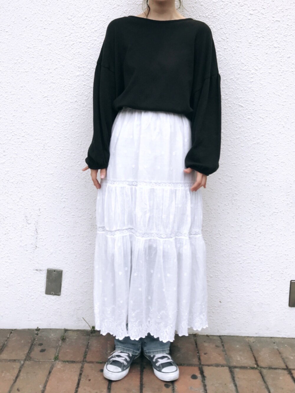 スカートとジーンズを組み合わせるのが好きでよく着ます🐇 この古着スカートは友人からのプレゼントです🌿可愛くて嬉しくていつも大切に着ています。
