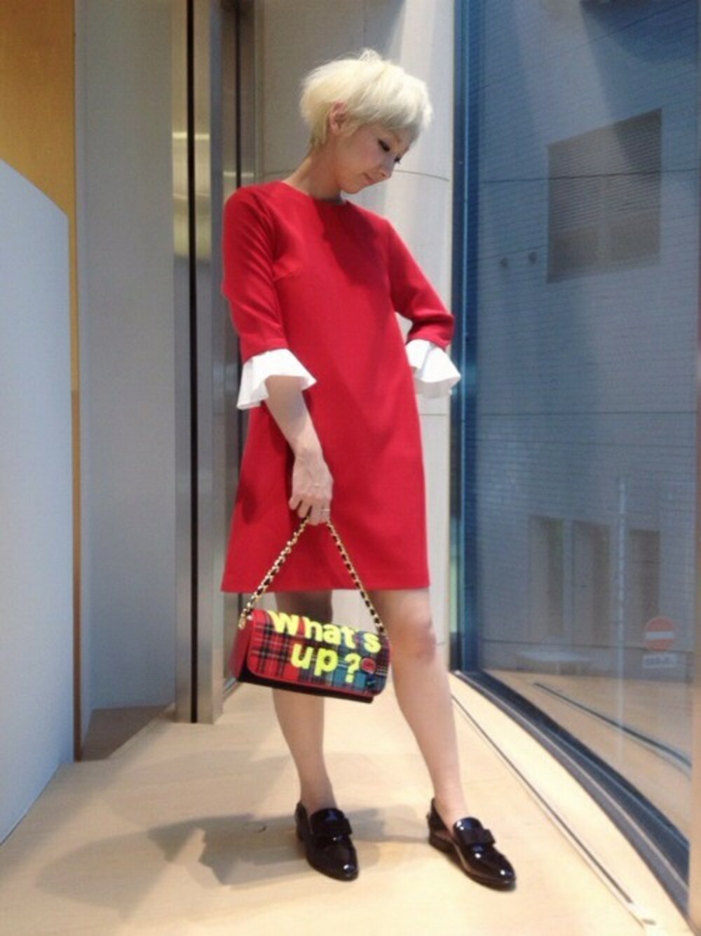 真っ赤ワンピ!巨大なカフス!チャーミングなメッセージ入りバッグでブリットパンクガールをイメージ!!!What's up?☻ もちろん、カフスを外してシンプルお嬢さんクリスマスコーデにも最適です♡