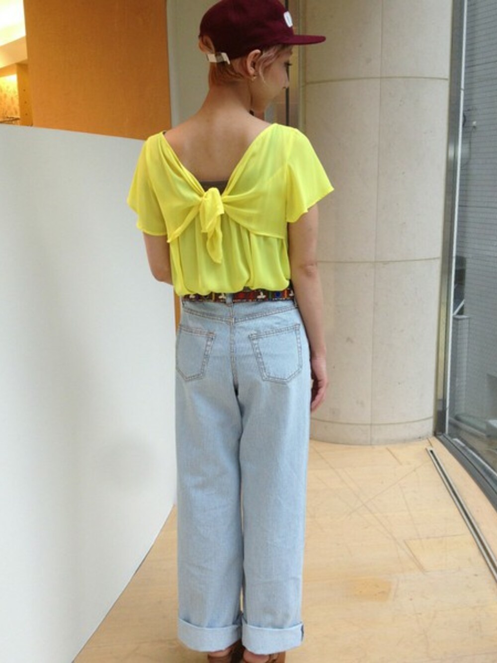 小尻効果抜群のパンツにバックスタイルに自信のもてるトップスを合わせました♪ あえてのエスニックベルトとキャップでBEAMSスタイルの完成です♪
