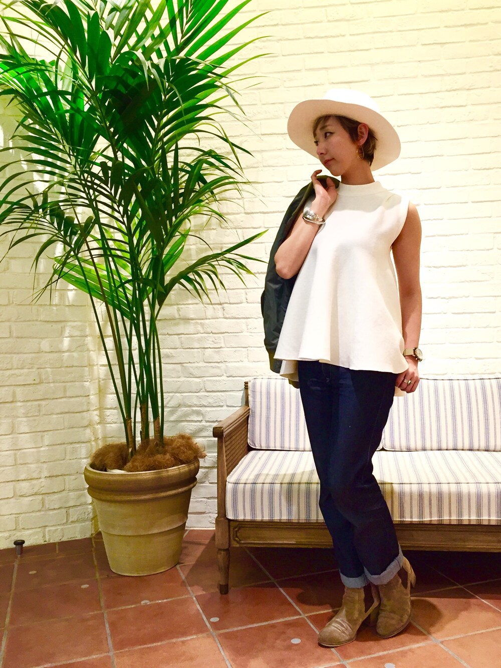 "RBS"(アールビーエス)のペプラムトップスは、特殊な編み方で美しいドレープを表現しています。 "UNUSED"(アンユーズド)の真っ白なハットで爽やかさをプラス。 すっきりしたデザインのインディアンジュエリー"ORVILLE TSINNIE"(オーヴィルツイニー)のバングルはどんなOOTDにも合う!! 私がしているのは厳密にはこの写真のデザインじゃないんだけど、期間限定イベントで手に入れた特別なもの。 大人への階段をひとつ上った感じがして、ドキドキします。