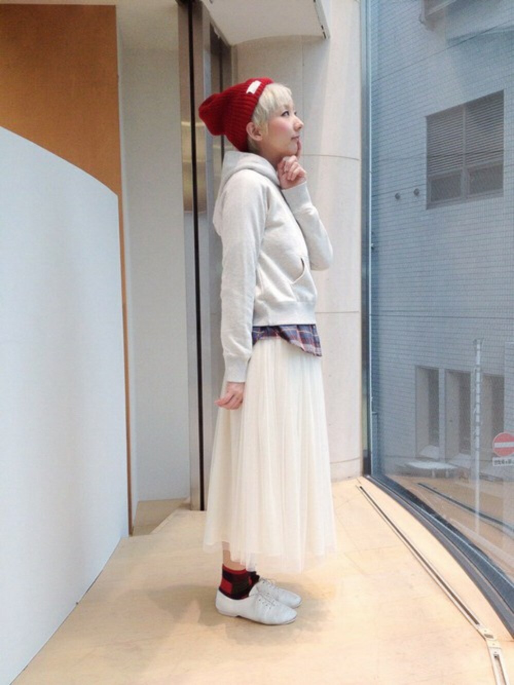 髪色をホワイトにしたのであえてのホワイトコーデ☆ 間にチェックシャツを挟んでこなれた感じにしました。