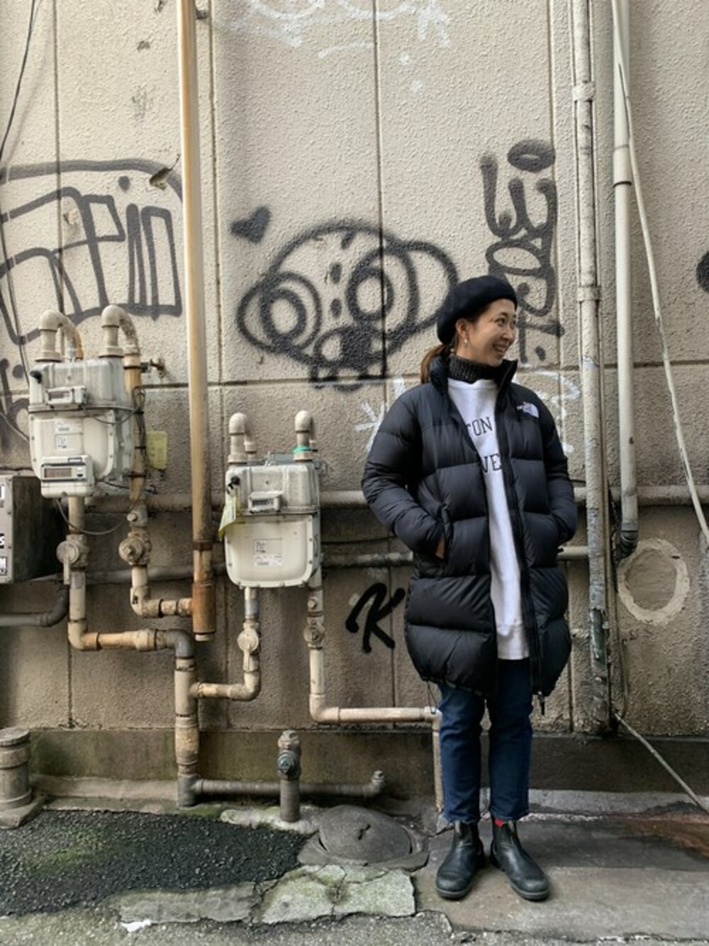 ノースフェイス、レディースサイズのMを着用しています ! ベレー帽とブーツでカジュアルダウンし過ぎないように^_^