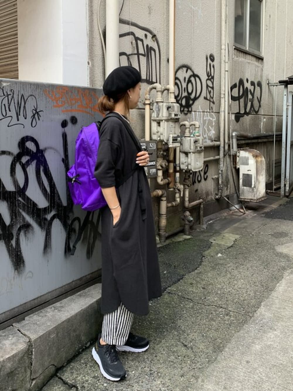 8/3発売のHOKA ONEONEスニーカーでコーディネート! スポーティにならないように、他のアイテムは黒でコーディネート!