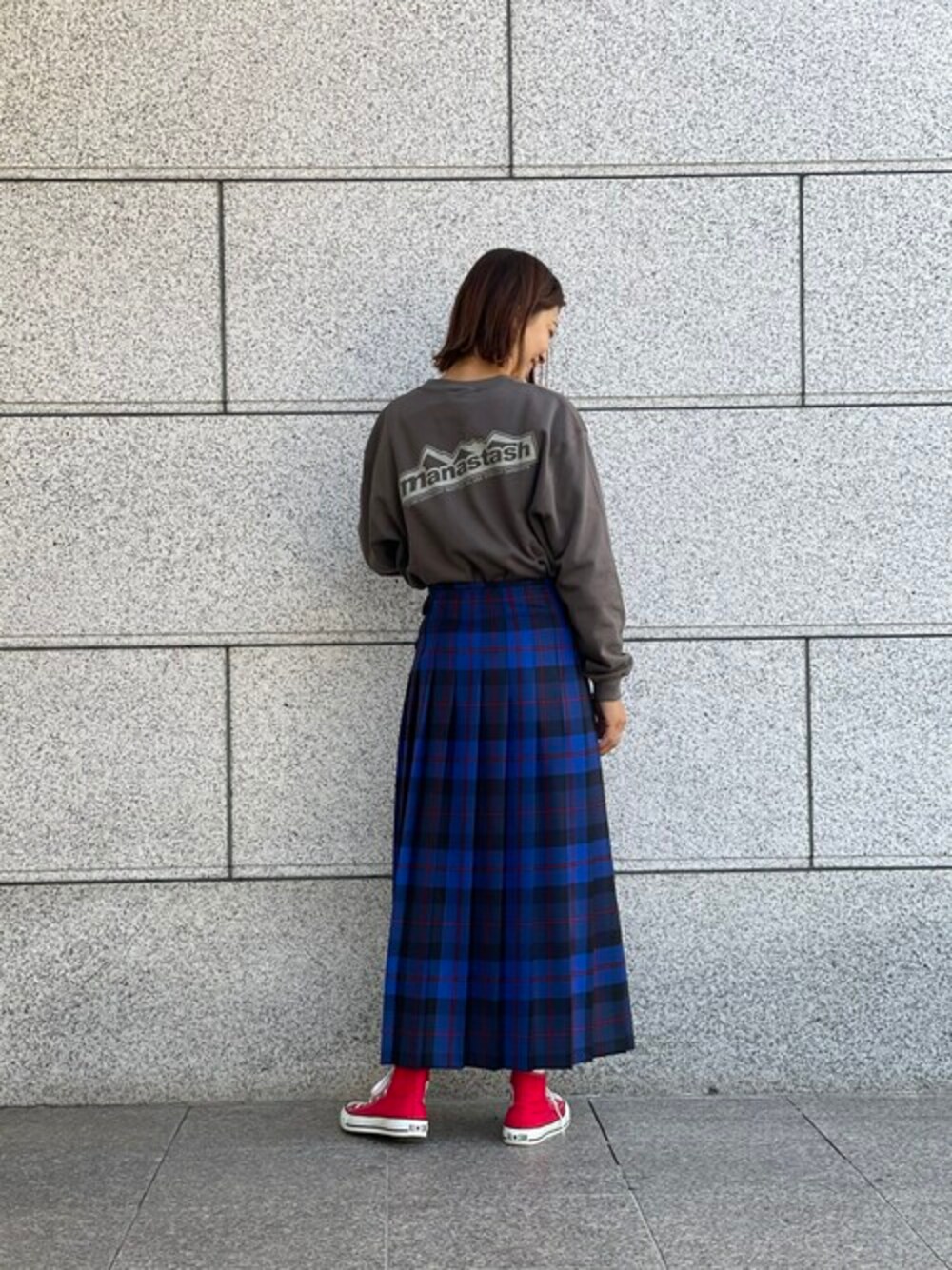 マナスタのバックプリントスウェットでコーディネート! おすすめは着用カラーのグレーです。