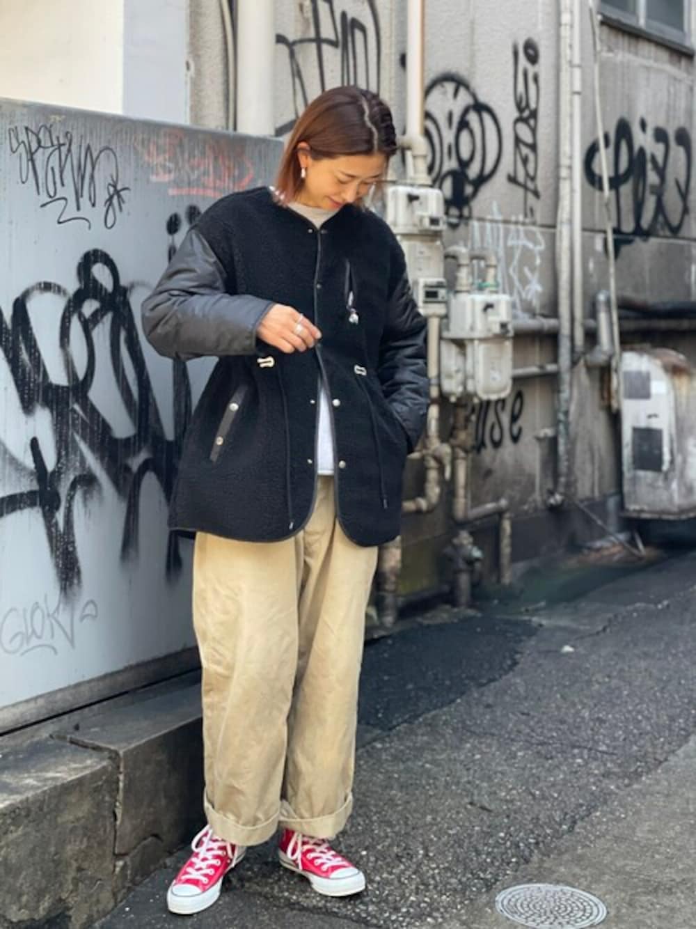 おすすめのマナスタのフリースアウター! ウエストのコードを締めるとカジュアルから女性らしく雰囲気が変わります。