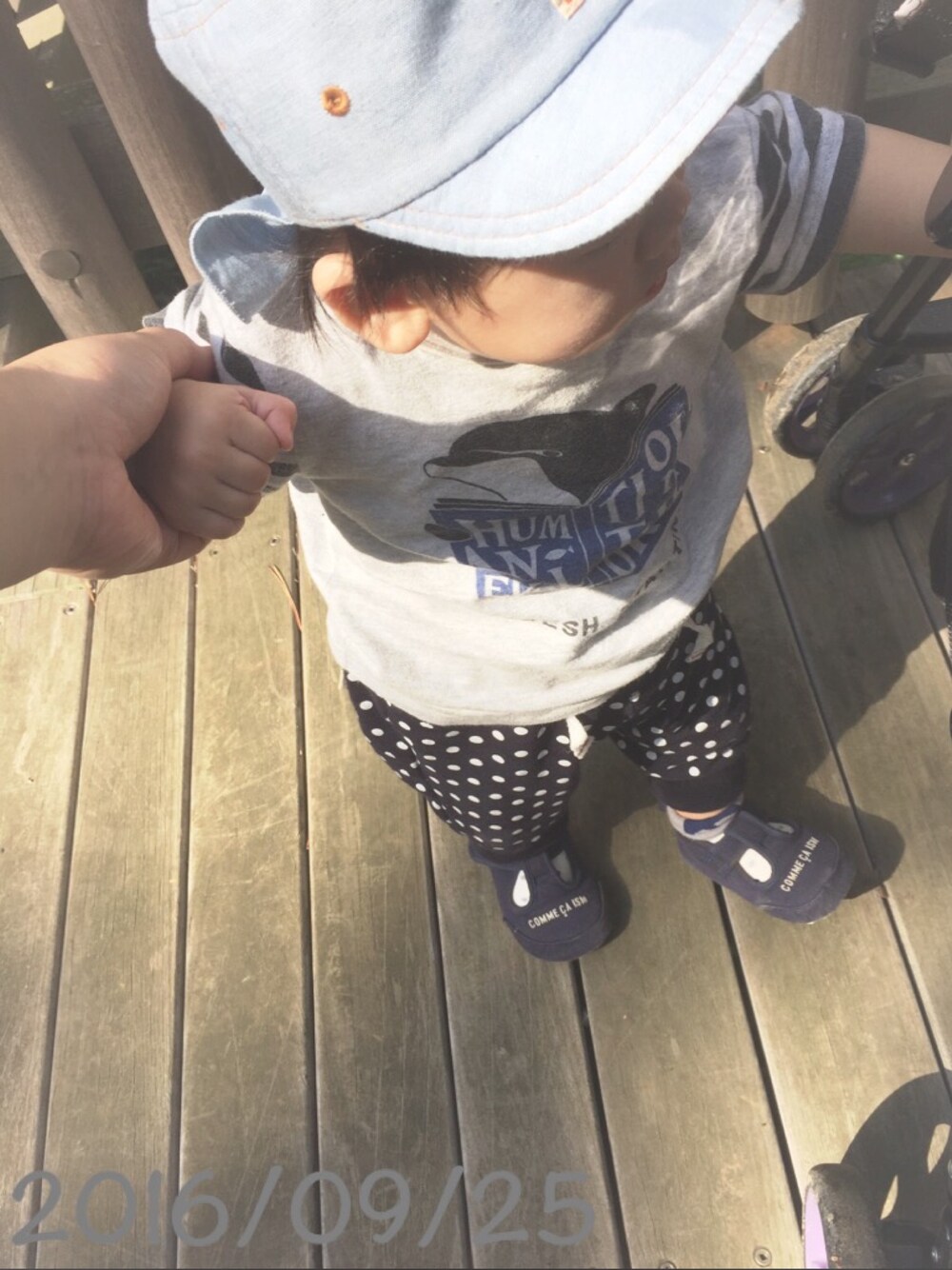 今日のコーデ*\(^o^)/* 今日は森林公園までお出掛け♡ 陽射しも強そうなのでキャップを装着! 調子に乗って昨日に引き続き靴下を… さらに調子に乗ってファーストシューズを… ……案の定激しい抵抗を見せた息子さん^^; 公園では嬉しそうに足踏みしてましたw このファーストシューズはお姉ちゃんのおさがりですが、色違いで赤色もありました! 横浜で失くした苦い思い出ですww いつも見てくださる方、初めましての方 イイネありがとうございます! とても嬉しいです( ´͈ ᗨ `͈ )◞