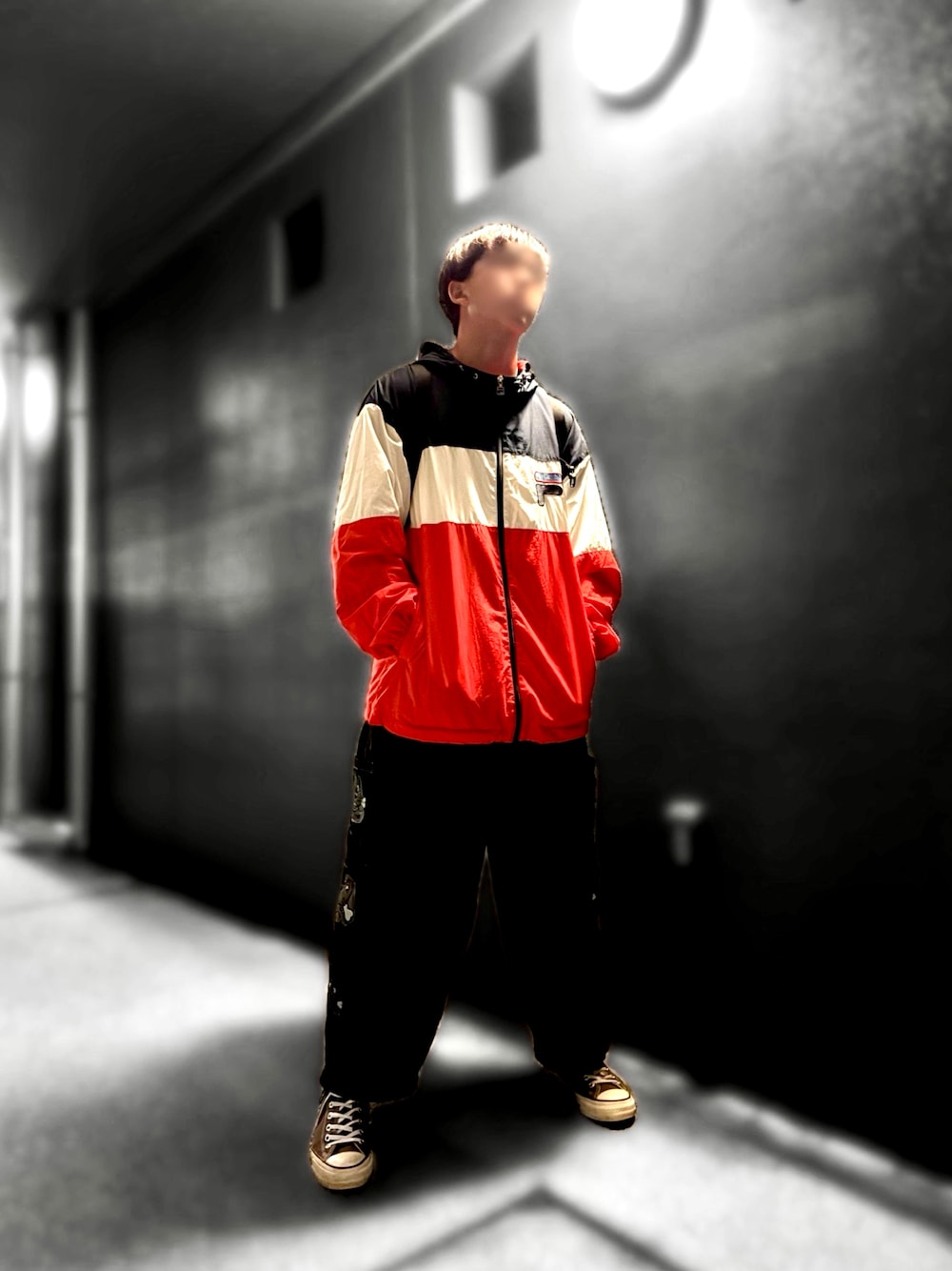 FILA のビッグロゴ「ナイロンフーディージャケット」は原宿の古着屋さんで購入 ラッパーミメイさんが着用していたGALFY×MeetsAnswerのセットアップのパンツ。貯めたお小遣いで買った初めての服