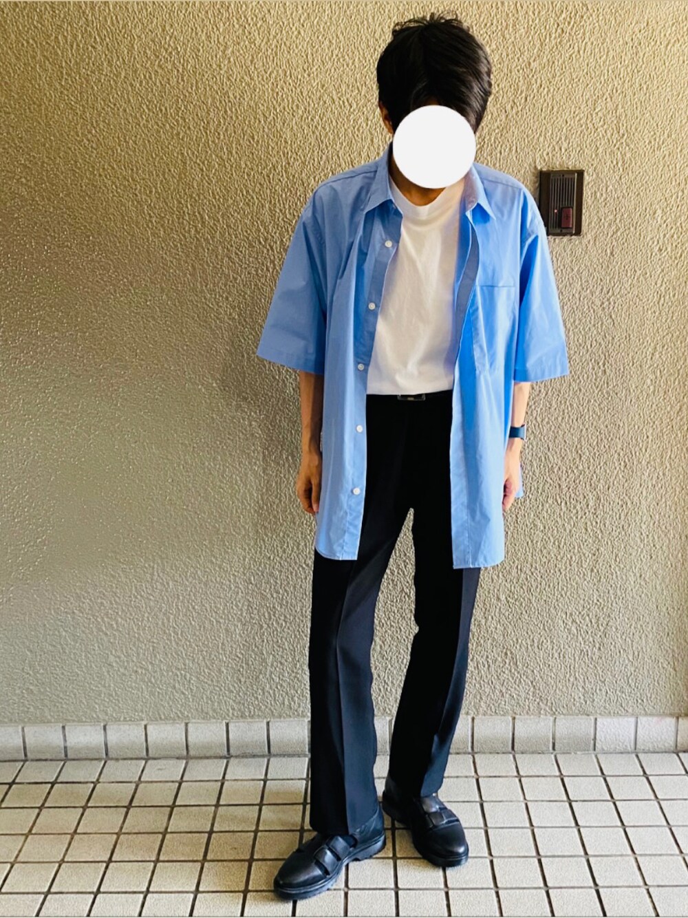 白Tのタックインコーデ。脚長効果で大人っぽくなります。青シャツも合わせて爽やかさも忘れずに。