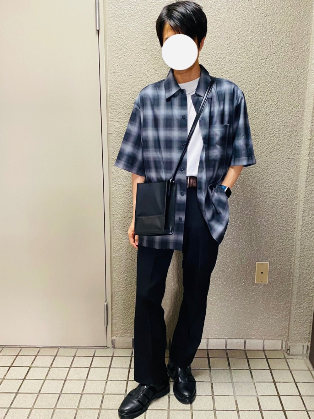 オンブレチェックシャツのタックインコーデ。モノトーンのタックインは結構好きです。