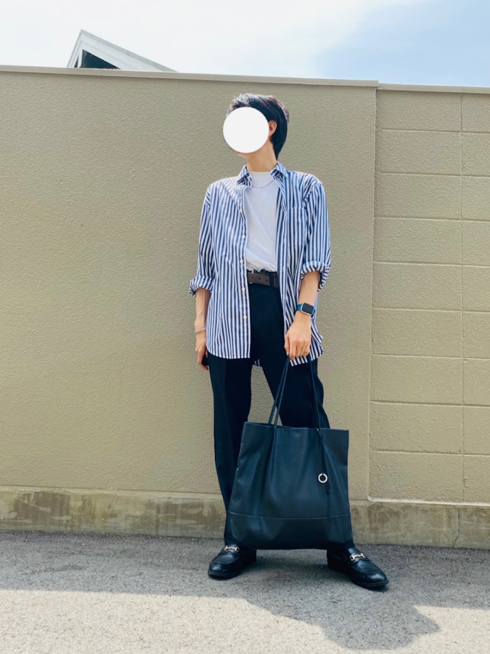 ブルーのストライプシャツコーデ。 袖を捲ってアクセサリーを見せることで、爽やかな雰囲気にしてみました✨ 夏らしい色味のシャツは羽織るだけで気分が上がります☺️