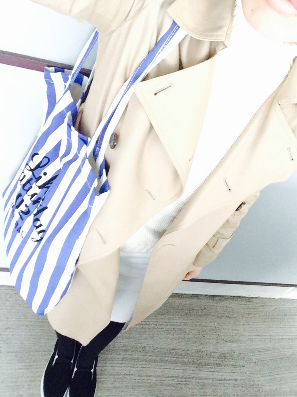 古着コットンのタートルニット ジャーナルのタイトスカート 日本製のスェードスリッポン トレンチコート! しましまトート もうコート着たくない♡ ライナーつきのトレンチ♡