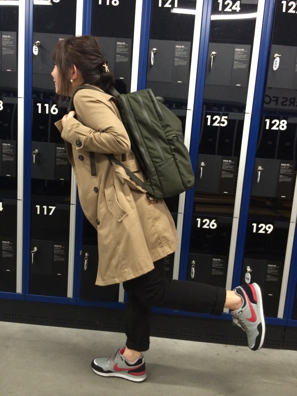 サロペットにシャツを着ています! リュックたくさん入って最高♡