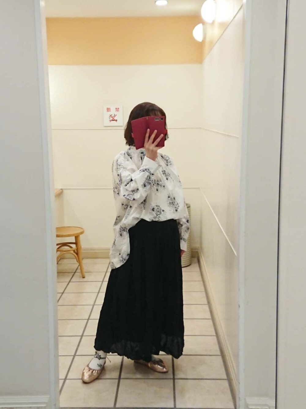 お花の線描きプリントとブラウスに ワッシャー加工のワイドパンツで キレイめ春コーデ🌸