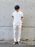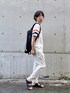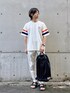 【ホワイトトーンコーデ】 スポーティーでありながらもシンプルで洗練された印象を与えるスタイルです。ホワイトとブラックの基本カラーにオレンジとネイビーのアクセントが効いており、全体的にバランスの取れたルックに仕上がっています。 - **トップス(Tシャツ)**: ホワイトのTシャツは、袖にオレンジとネイビーのストライプが入っており、スポーティーな印象を強調しています。シンプルながらもデザイン性が高く、カジュアルなコーディネートに最適です。 - **パンツ**: ホワイトのパンツは、全体のコーディネートを明るくし、クリーンな印象を与えます。テーパードシルエットが脚を長く見せ、スタイルアップ効果も期待できます。 - **バッグ**: ブラックのリュックは、シンプルでありながらも実用的なデザインが魅力です。軽量で持ち運びやすく、スポーティーなスタイルにマッチしています。 - **サンダル**: ブラックのサンダルは、全体のカラーバランスを整え、カジュアルで快適な履き心地を提供します。夏のコーディネートにぴったりで、軽やかな印象をプラスしています。 このコーディネートは、シンプルながらもディテールにこだわりが感じられ、スポーティーかつ洗練されたカジュアルスタイルを実現しています。オレンジとネイビーのアクセントが全体のバランスを引き締め、爽やかな夏のルックを完成させています。