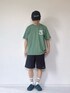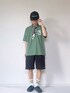 グリーンのロゴTシャツを主役に、シンプルなブラックショーツを合わせた大人のカジュアルコーデ。スカーフやキャップでアクセントを加えつつ、足元はソックス×サンダルで抜け感をプラス。夏らしく、動きやすさも意識したスタイリングです。