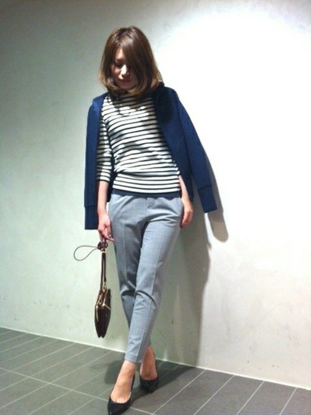 今年注目のイージーパンツです!! 足元をキレイ目に合わせ、あえてトップスはボーダーニットにメンズ仕様のパーカーで 外しを効かせました♪ ボーダーニットも体に沿うラインで女性らしく、大人コーディネートです☆