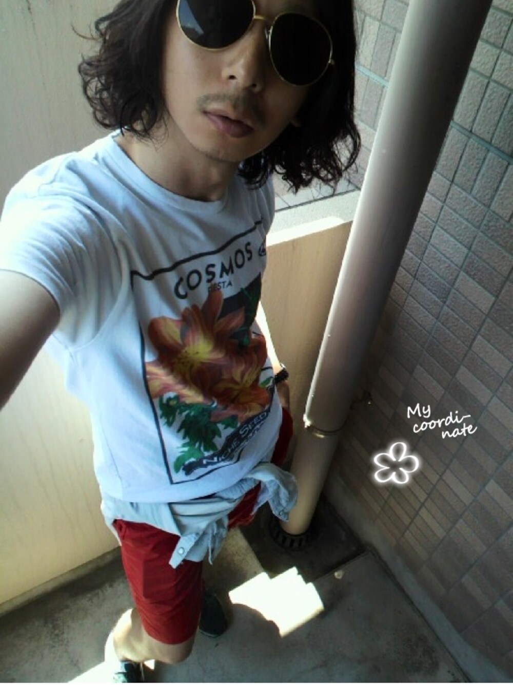COSMOS爛漫 お気に入りのNicheのフラワーTシャツに赤のショーツにデニムシャツを腰巻してスタイリングしました☆ テーマは夏の花です!