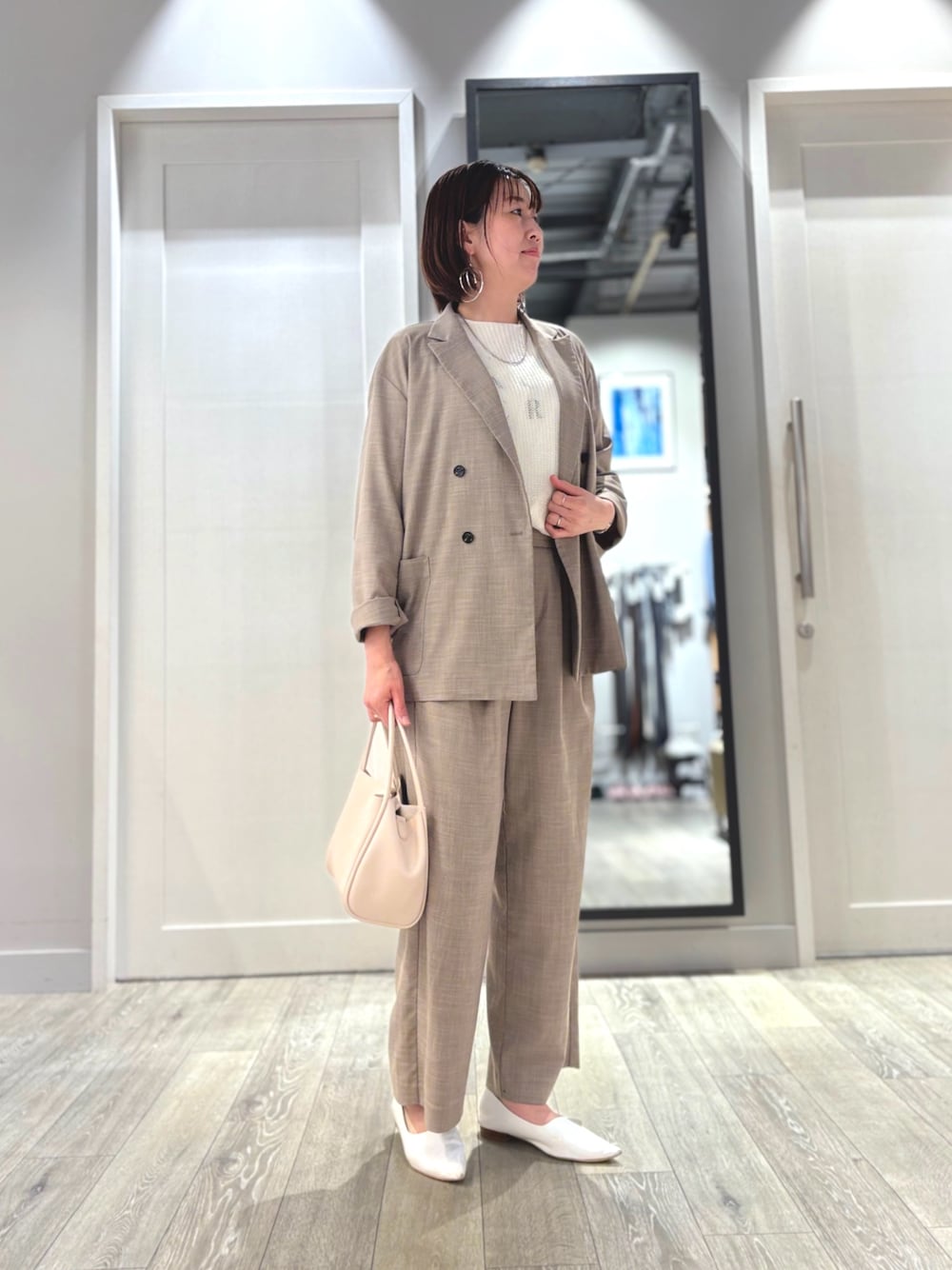 ジャケットは、ゆったりとしていてTシャツ合わせから、お仕事まで使いやすいです。 パンツもタックが入っていてラインがキレイです。 お手入れも自宅で出来て便利◎ リネンシアーニットはゆったりとしていて重ね着しやすく、インするとすっきり見えして、色々なボトムに合わせやすいです。 よろしかったら商品紹介ページをご覧ください。