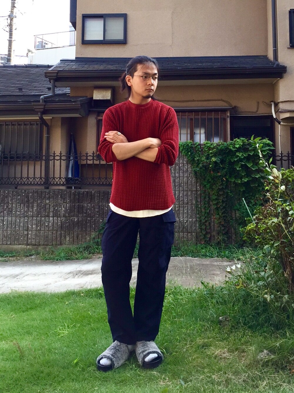 サーマルにカーゴ ミリタリーを敢えてらしくない色で着る 最後にサンダルが全部持っていく