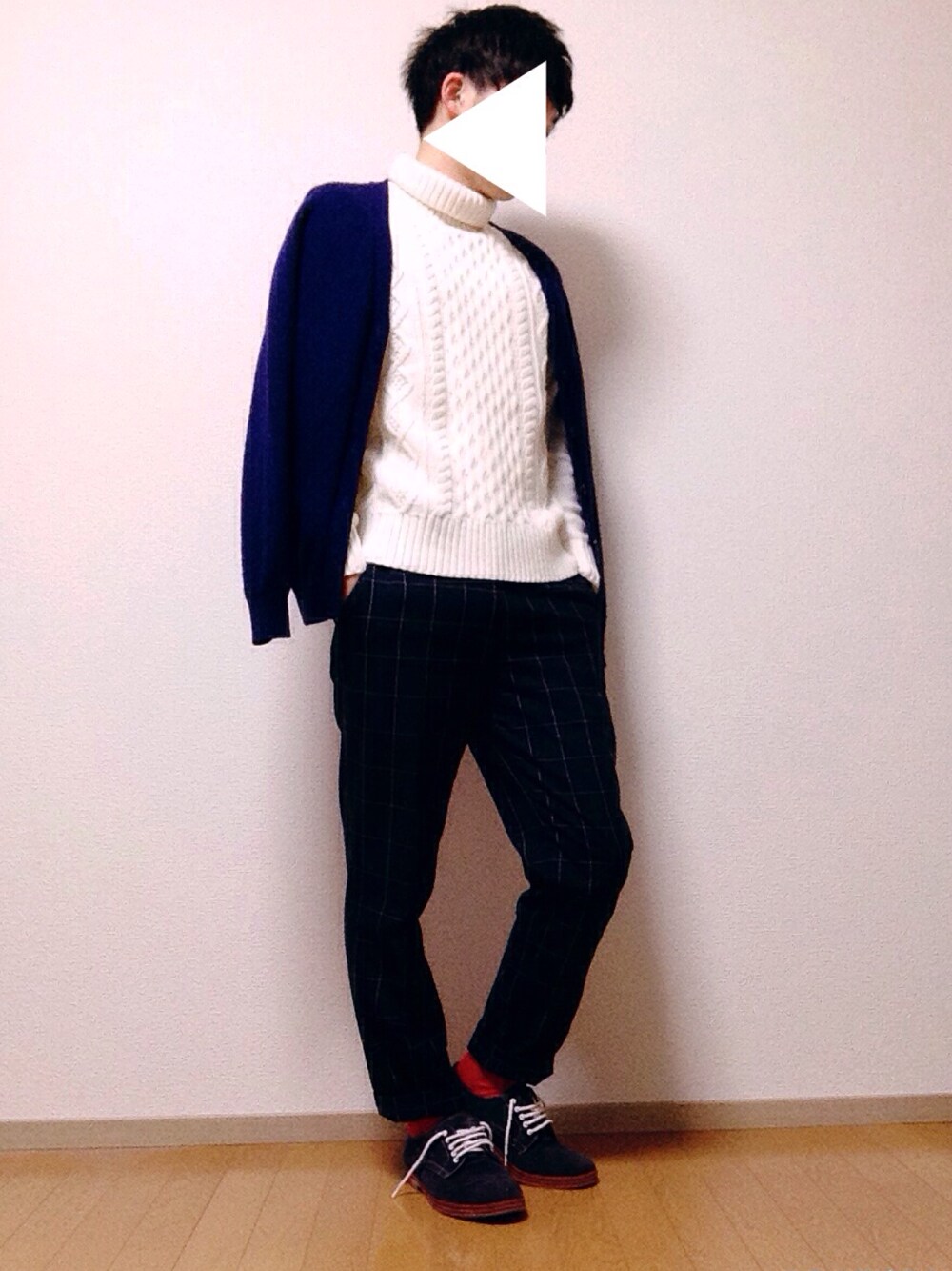 今日は昨日よりも気温高いみたいですね タートルネックとチェックパンツで 綺麗めコーデにしてみました! 紺と白でまとめて赤の靴下は さし色として使いました(^^)