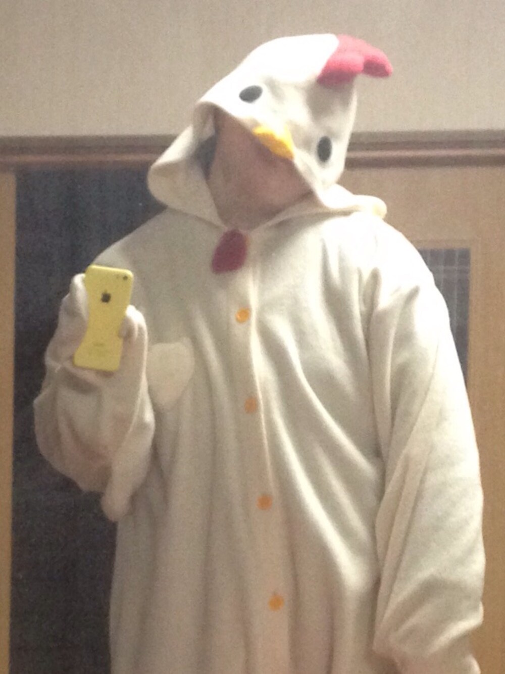 鳥です。あったかいです。 手に持ってるのは堅焼き卵ではなくiPhoneです。 中にあたたかいものをたくさん着ています。決して私単体の体の幅ではありません。