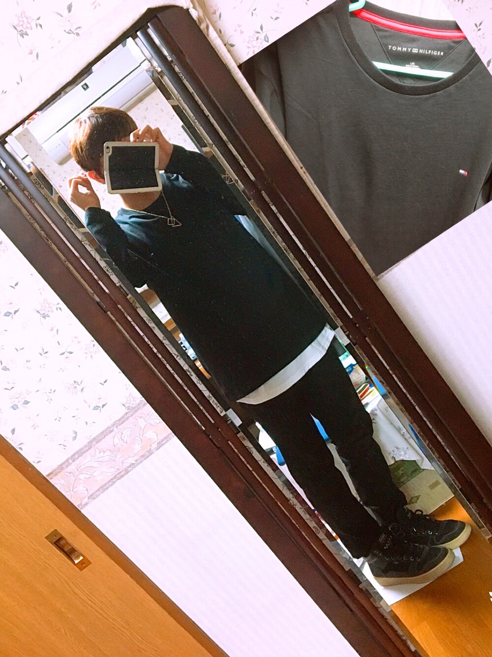 初めて買ってみたTOMMY HILFIGERの黒Tシャツ👕 中の赤線も凄くかわいい🐹😬 あ、ネックレスは一目惚れして即決で買った😃