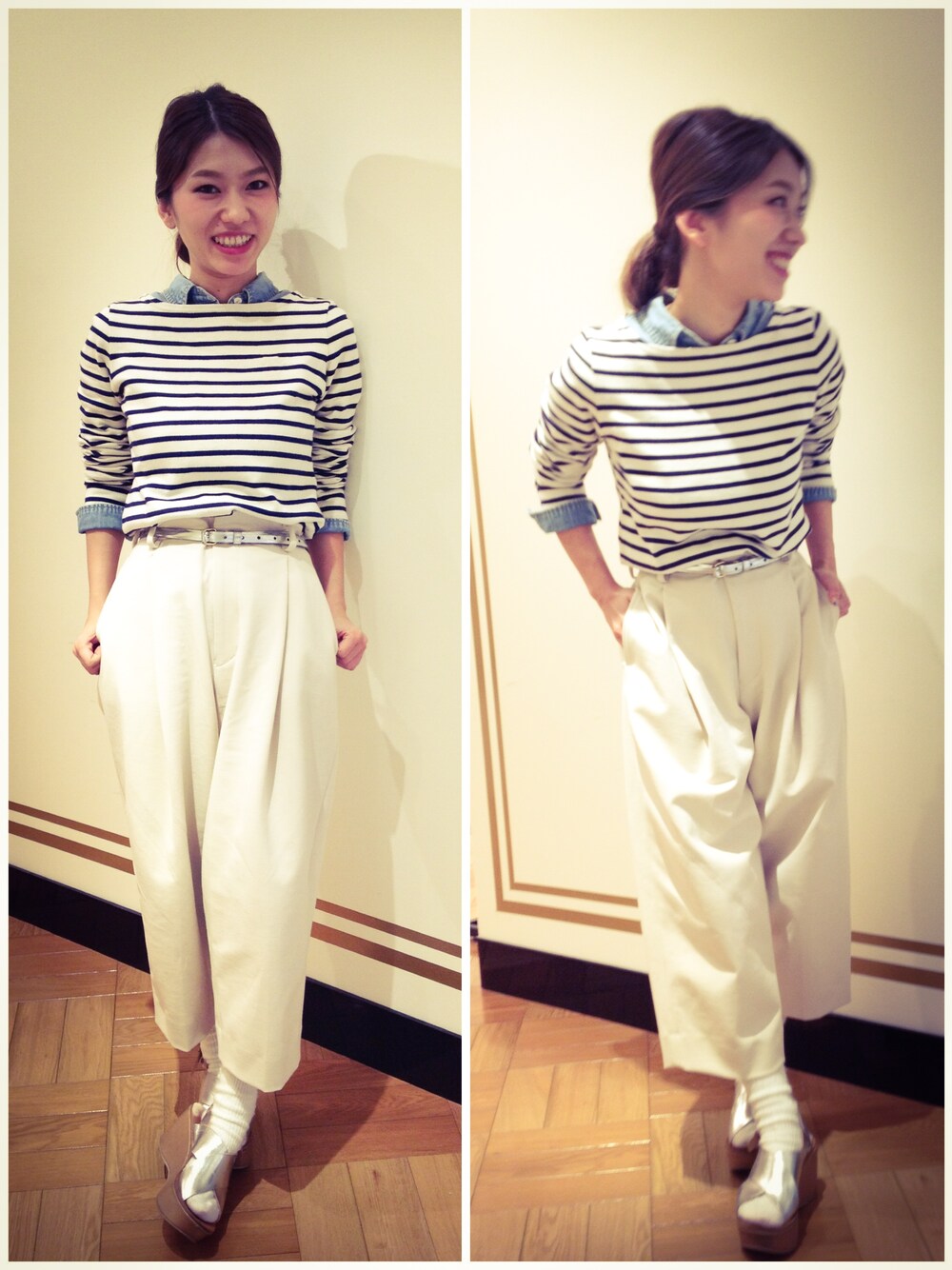 デニムシャツ×ボーダー×ワイドパンツ