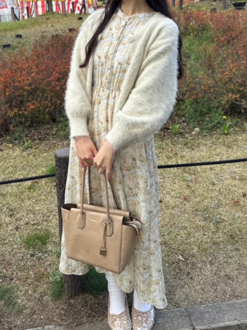 結婚式の翌日に桜まつりに行った🌸 お嬢様気分が抜けずに、花柄ワンピにふわふわカーディガンを着ていった〜◯ 汚れないようにめちゃめちゃ気をつけたな、、、