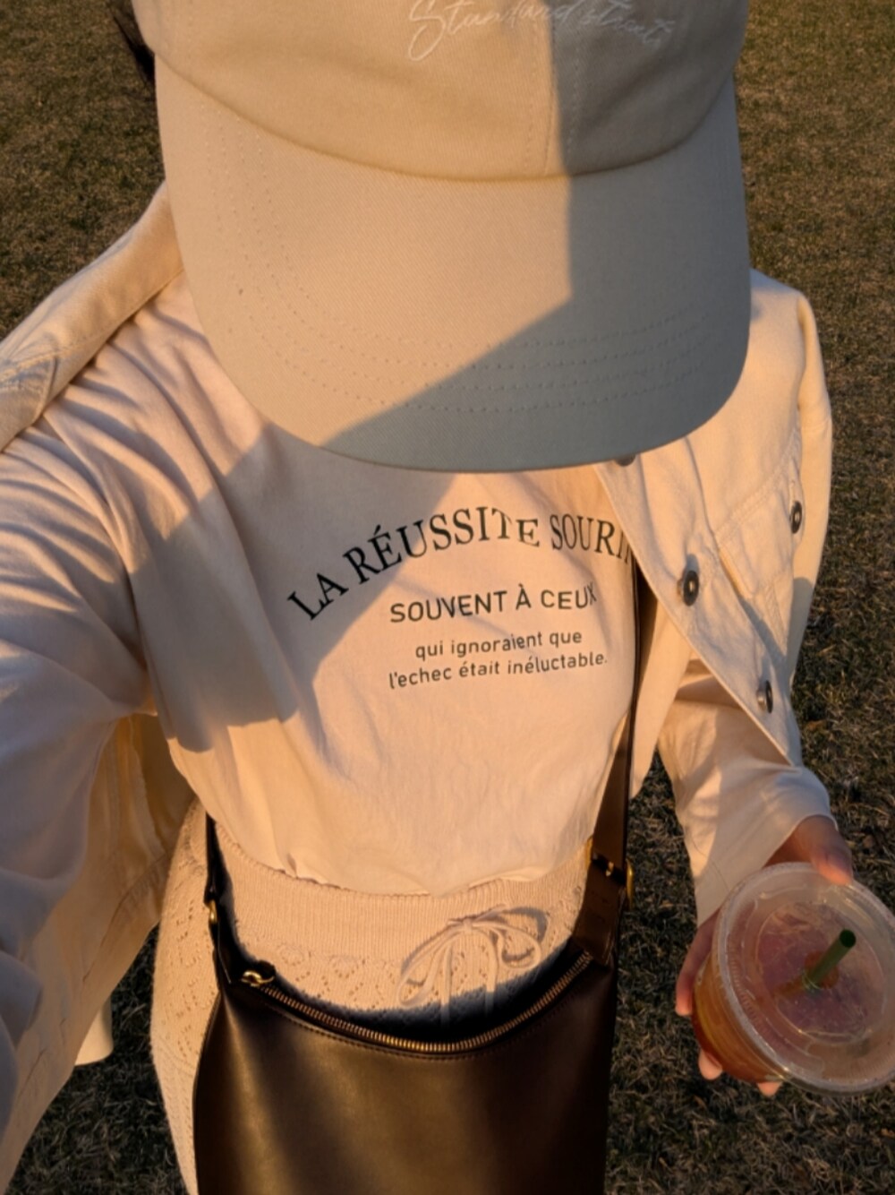 スタバを買ってお散歩した日🌇 夕陽が眩しかったけど、いい感じに撮れた📸 オールホワイトにブラウンのバッグを差し色に◯