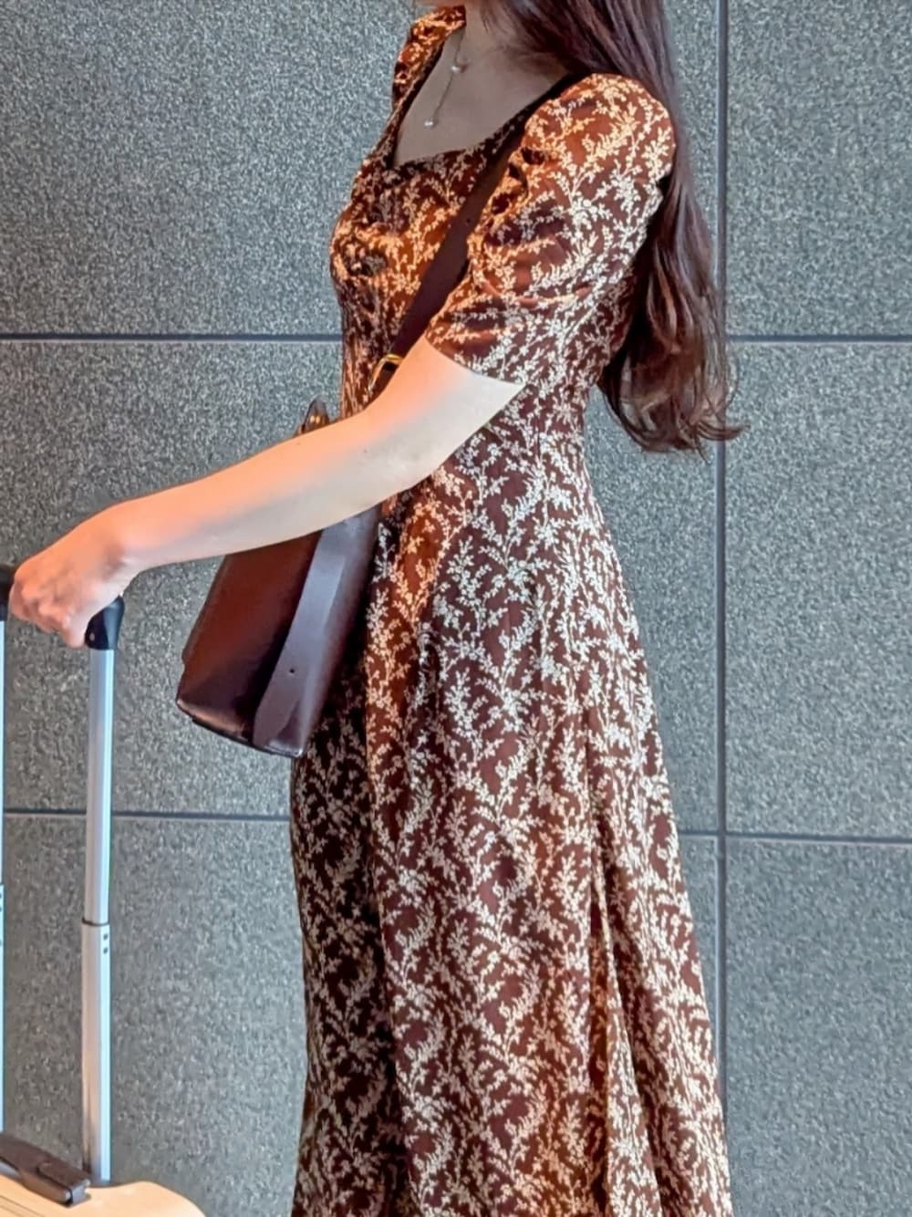 ほんとーーーにこのワンピ大好き! レディなライン出しつつ、 だけど肌見せが少ないデザインが大好き 夏のブラウンもあまり見ないからオシャレ!!