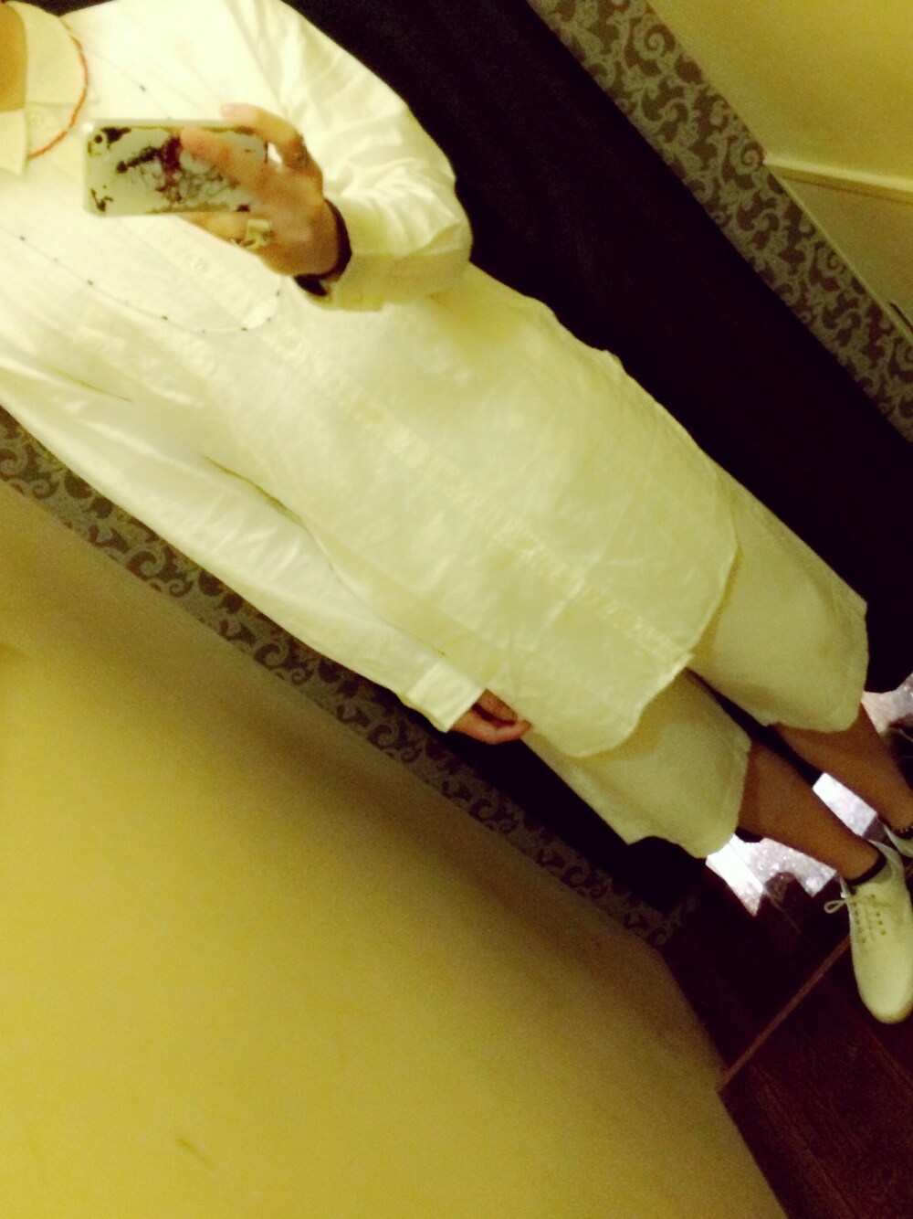 オールホワイト サイズ感のバランス パンツはMでワイドに シャツはLでルーズに。