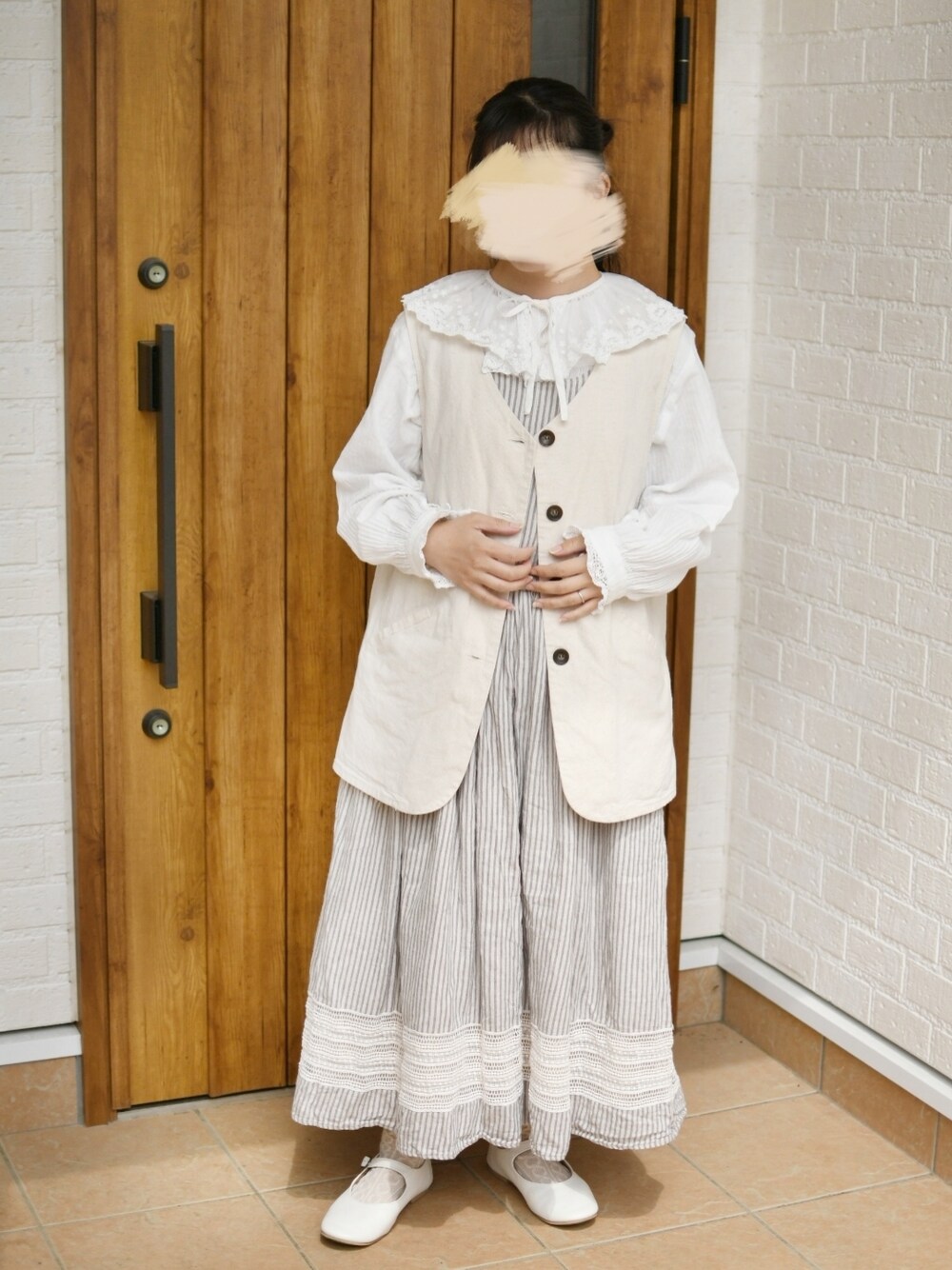 エプロンワンピースに付け襟♡ ガーリーで可愛いですが 今日はベストを着て控えめなガーリーに ブラウスの袖のレースがとても好きです❁*。