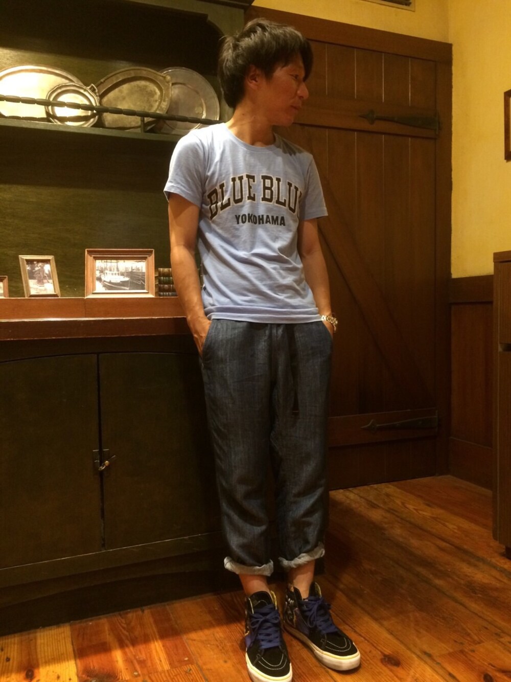 暑い日が続きますね〜。 汗っかきの僕には厳しい季節です(^_^;) 脚が短いので、パンツは少し(?)ロールアップしてみました( ̄▽ ̄) 服のコーデ、着こなしはほんと難しいわぁ。皆さん、上手に着こなしますよね〜。 撮影者 娘