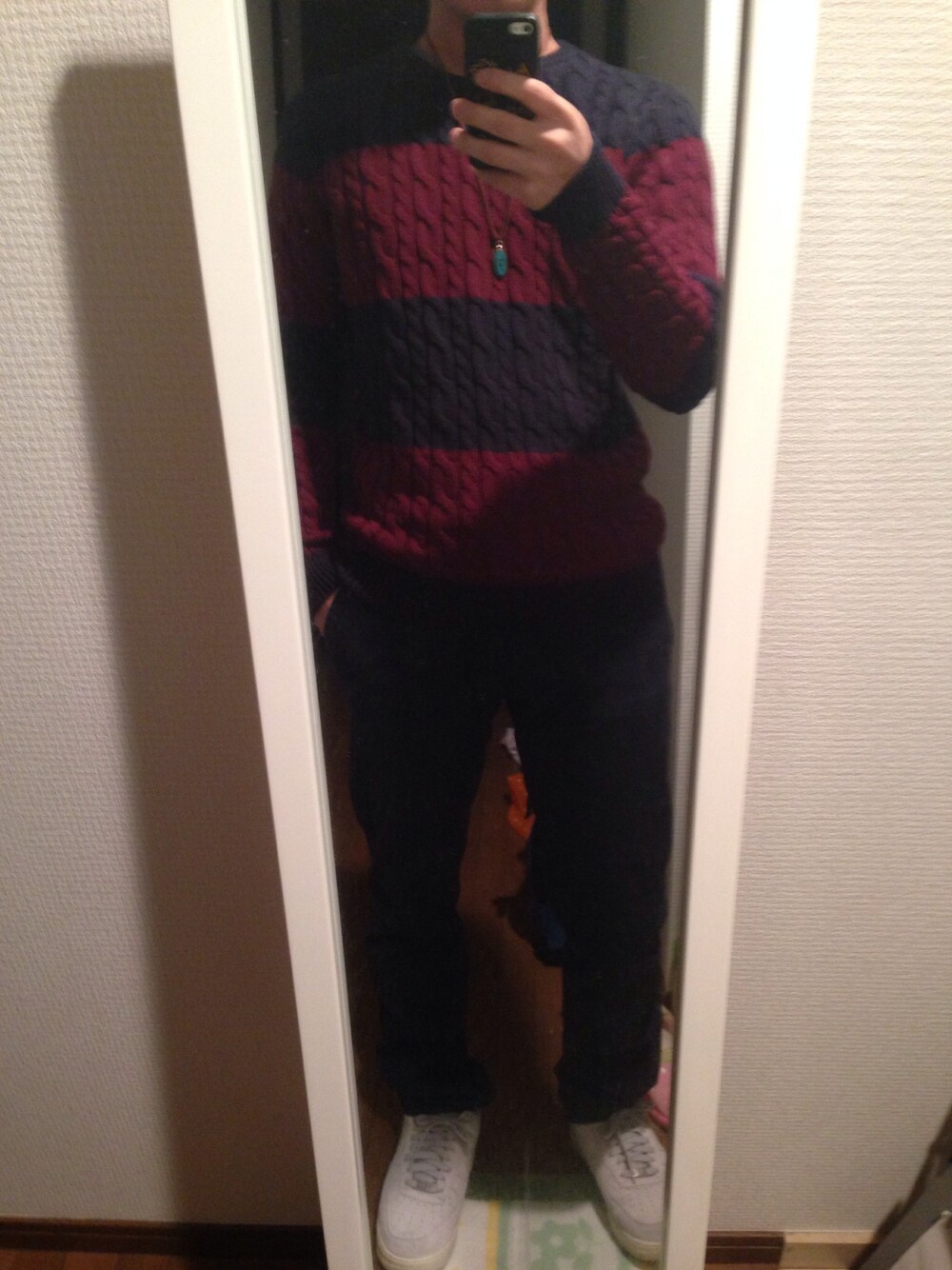 お気に入りのグレー×ボルドーのニットでシンプルにコーデ^o^ ネックレスがアクセントになってます(。-_-。)