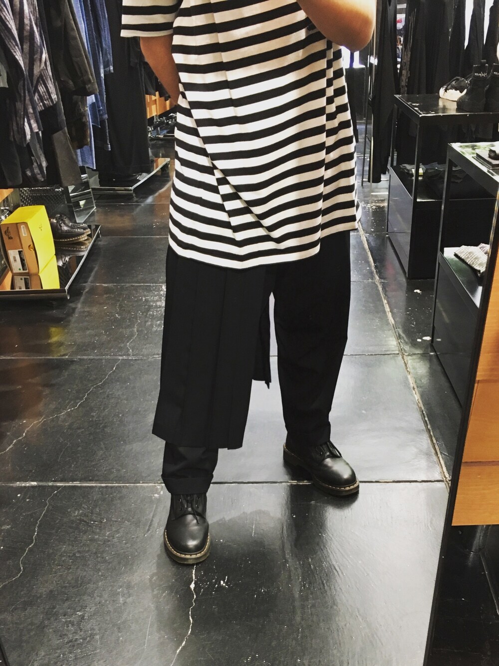 yohji yamamoto POUR HOMME 18SSのスカパンとボーダーのスタッフシャツの組み合わせ。17年の yohji yamamoto×Dr.martensも10フォールもイケ。