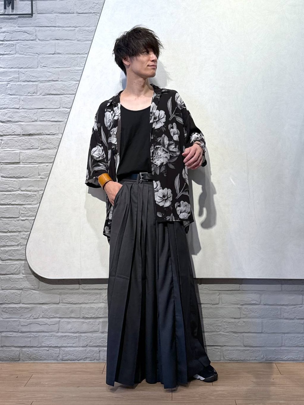 ▪️トップス 花柄がインパクトあるシャツアイテム。 柄物でもモノトーンなら着回しもしやすく夏らしさもありオススメです◎ ▪️ボトムス 袴のようなデザインのワイドパンツ。 なかなかないデザインなので、少し周りとは違うコーデをしたい方にオススメしたいパンツです!