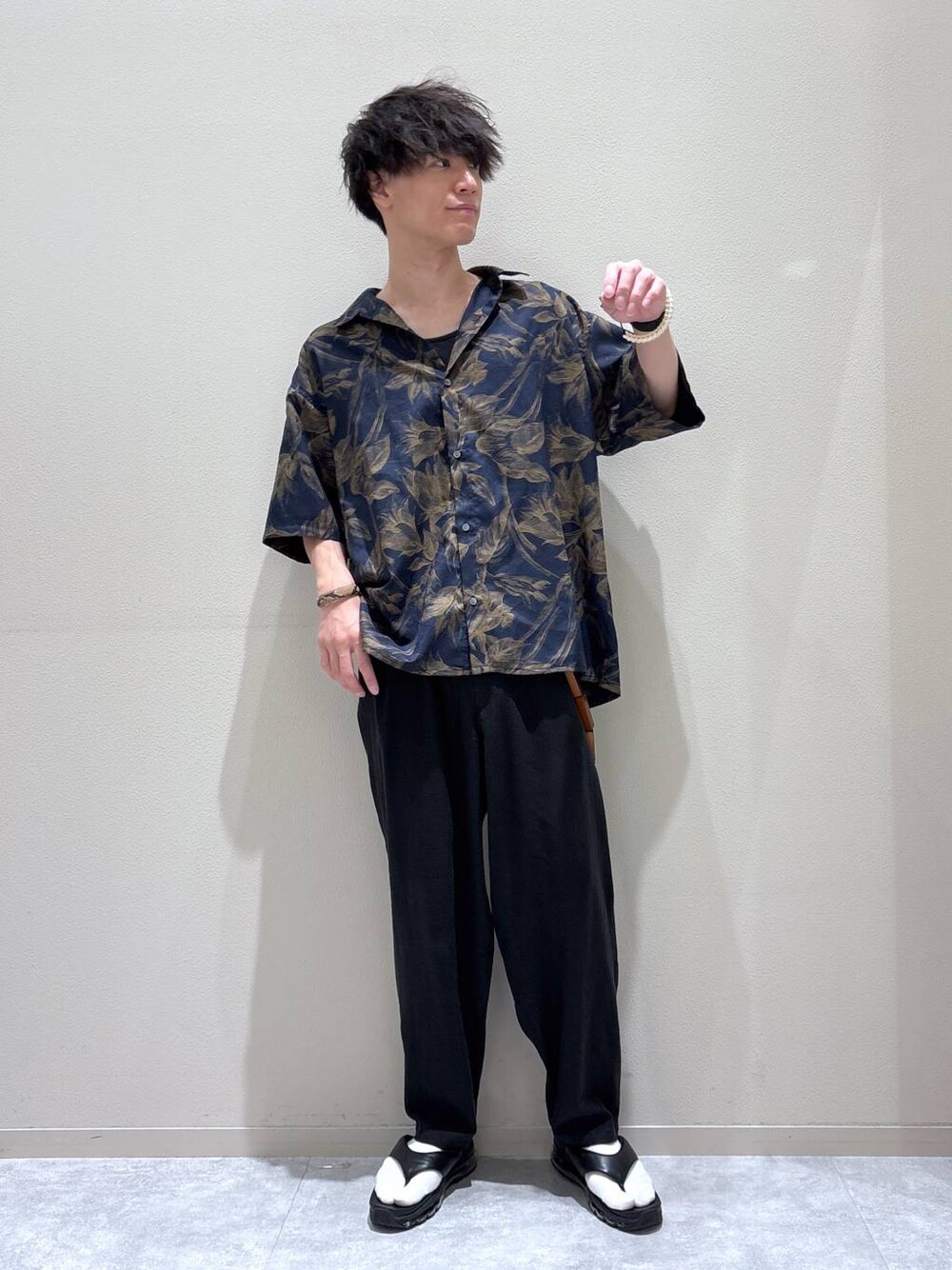 ▪️トップス 一枚でサマになる主役級のシャツアイテム! 少し和なテイスト感でもありスタイリングに変化をつけることができますよ! そして、色味自体は落ち着いているので着回しもしやすいのもポイント! ▪️ボトムス 生地も柔らかく落ち感があるため、あまり広がらないワイドパンツ!ワイドパンツに初挑戦の方でも安心してはいていただけますよ! ▪️シューズ 和なテイスト感を楽しめるサンダル! クッション性も良くはきやすいのでオススメですよ◎