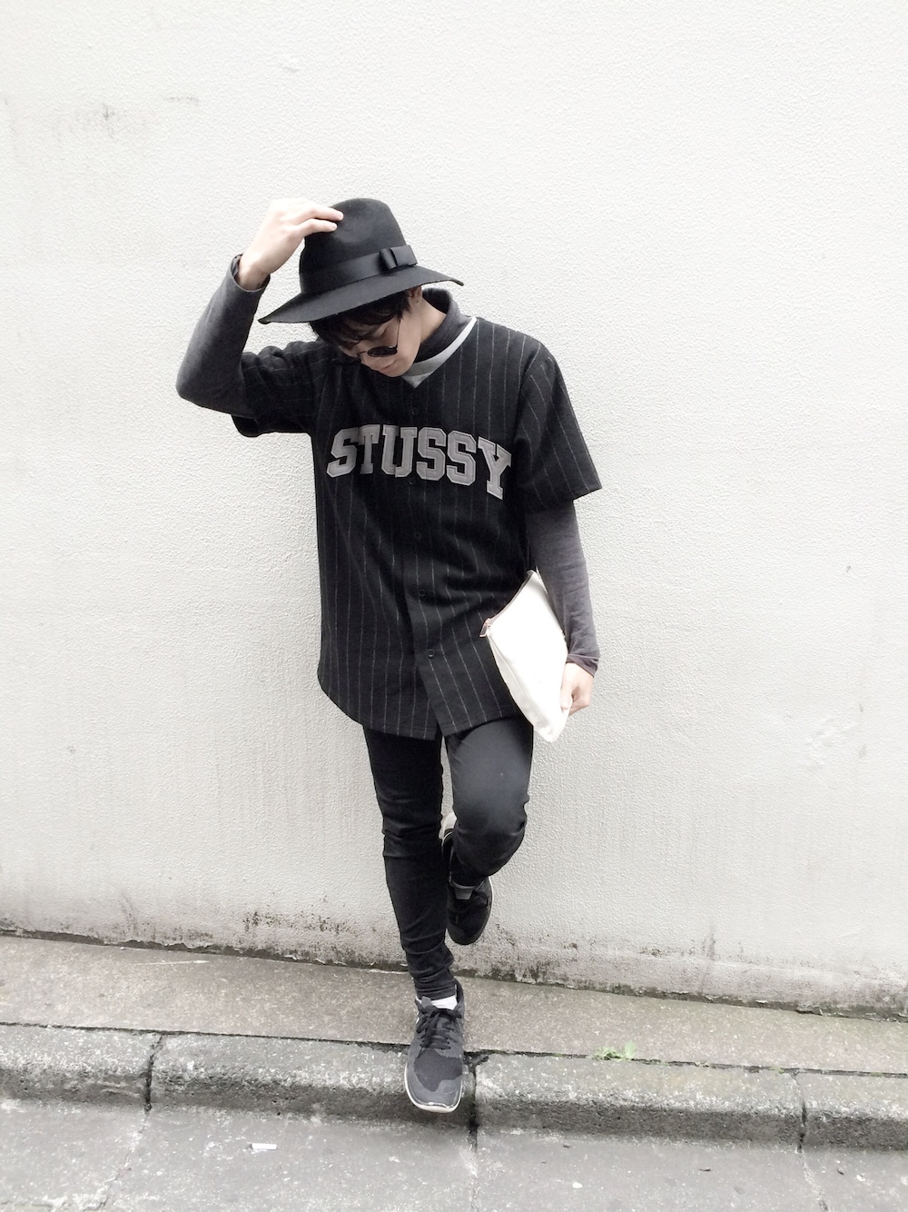 STUSSYのベースボールシャツを主役に使ったコーデ。 黒が基調で、他グレーに、小物で白(スニーカーのロゴ、ソール)の三色で構成されています。 配色はこだわりを前面に出しています ストリートさを残して、ストリートっぽくない上品なコーデを ハット、クラッチバック、タートルネックのインナー、サングラスで作る工夫をしました。 写真からはあまりわからないですが、アイテムを見るとわかるように、少しオーバーサイズを着ていて、首元からもわかるように三段レイヤードを さらに縦のラインを細く見せるようにインナーで締めて、黒スキニーなどを履いています。