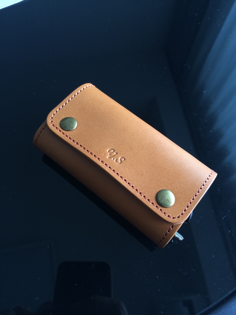 過去から現在、そして未来へ受け継がれる職人の技。 拘りのイタリーレザーキーケースやレザーアイテムをMADE IN JAPAN匠の技の逸品。 色はオーク、ステッチはキャメル、イニシャル刻印してもらって3000円くらいかな。 作りはしっかりしててお買い得だね!