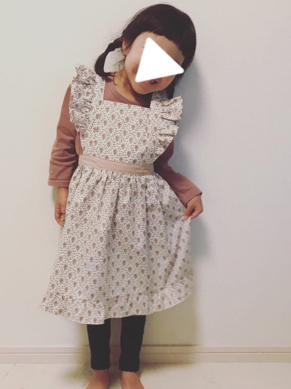 ブラック系のパンツ、ピンク系のエプロンを着用したキッズの秋コーディネートの1枚目の写真