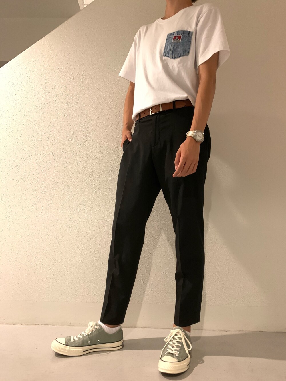こんばんは🌆 今回は、ワンポイントTのラフコーデをしてみました! ポイントは、色味を抑えつつ、胸ポケットの色と、靴の色の系統を合わせてみました!