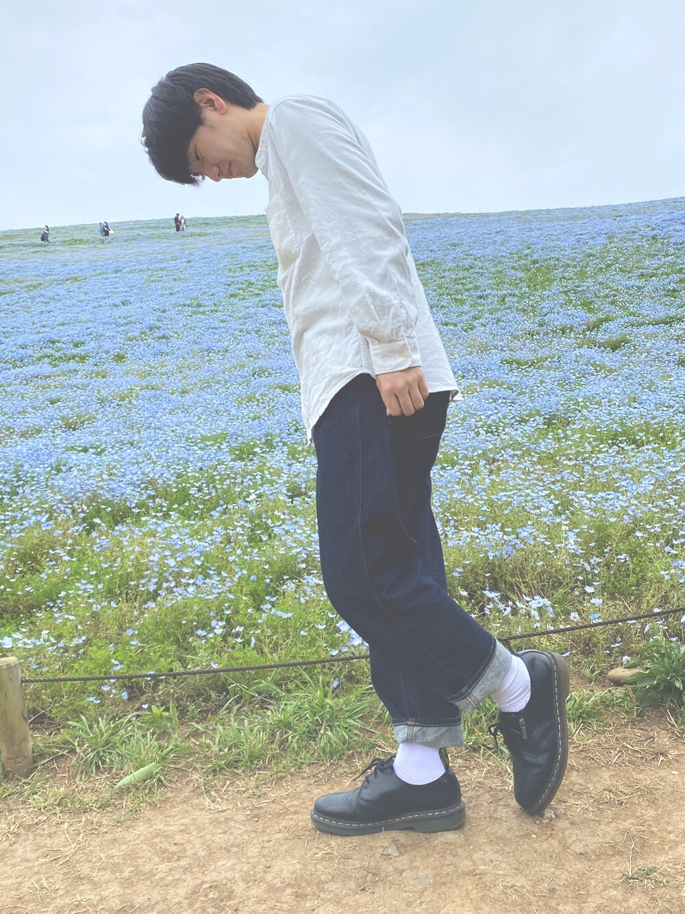 【不定期投稿】 〜men'sFUDGEに憧れて〜 昨日茨城のネモフィラに行ってきました 周りが明るい時は自分も清潔感のあるコーディネートで全体を統一 Instagram→yusansoundou shirt: GU belt: Calvin Klein pants: UNIQLO socks: UNIQLO shoes: Dr.Martin clock: KLON