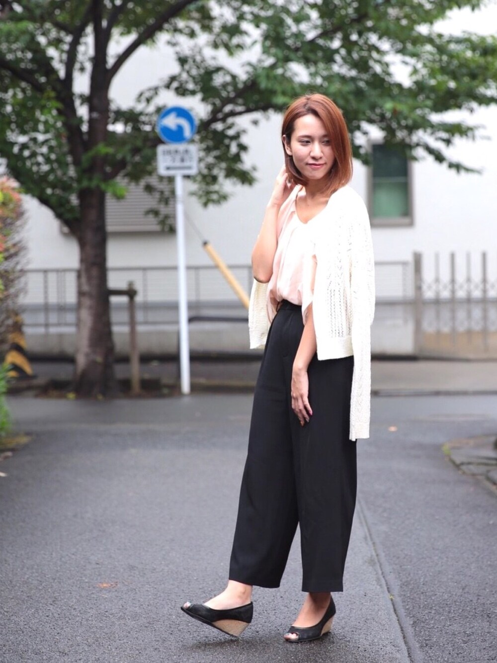 こんにちは😃 見てくださってありがとうございます♡ OLっぽい感じ。 ピンクのシフォントップスにワイドパンツで綺麗めに。 ざっくりした網目のカーディガンは羽織るぐらいが可愛くて好き💓