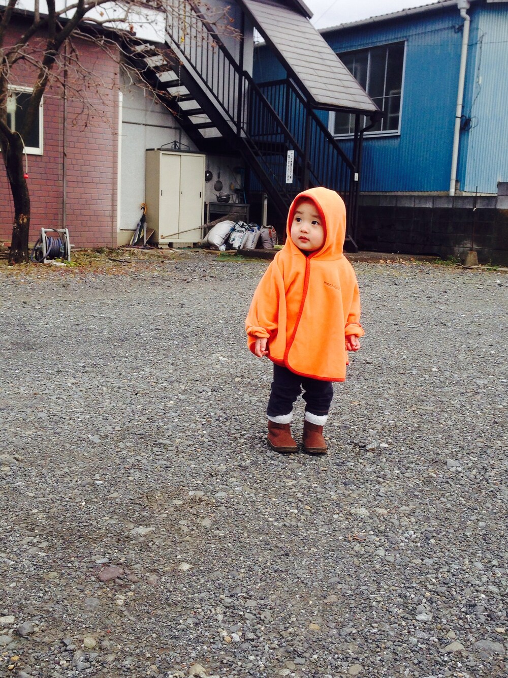 奥さんが買物してる間にお散歩。 上着が車の中だったのでポンチョのフードで防寒対策。 ちょっとモデルぶってる息子が可愛い。