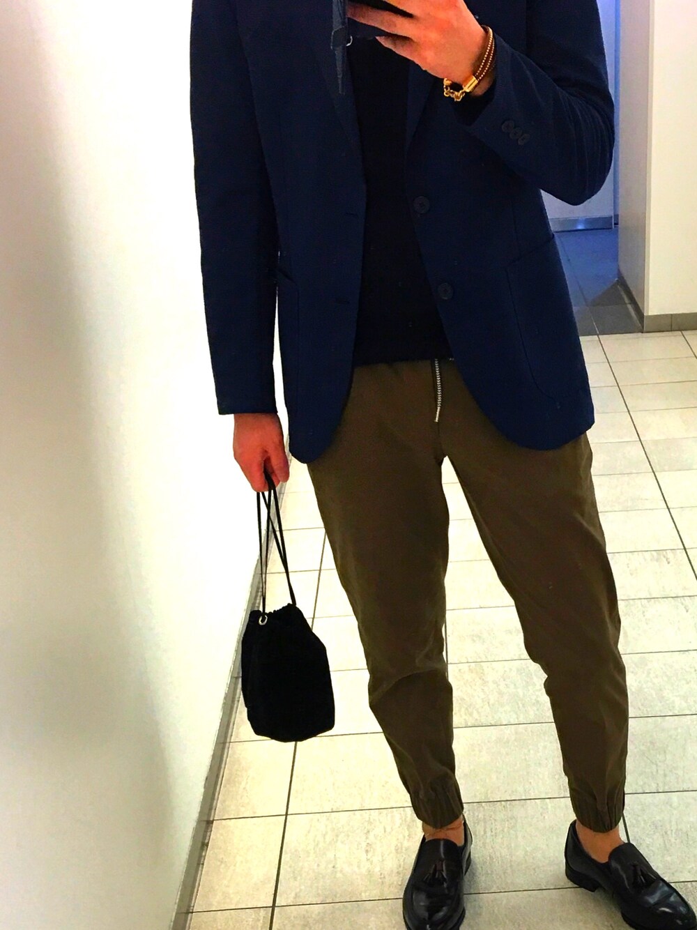 今日は暑いのでシアサッカーのジャケットにしました。 パンツはドローコードで楽です。