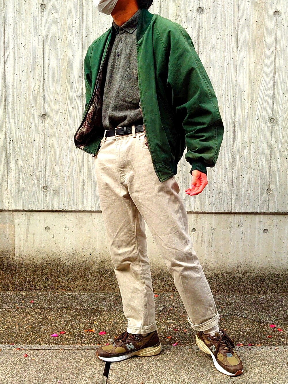 90sのエディバウアーのブルゾンと90sのゴルチエのポロシャツで渋さを演出しつつ ユニクロUのセルビッジデニムで白と緑のコントラストをコーデに組み込みました ブルゾンのチラ見えする裏地がアクセント♠