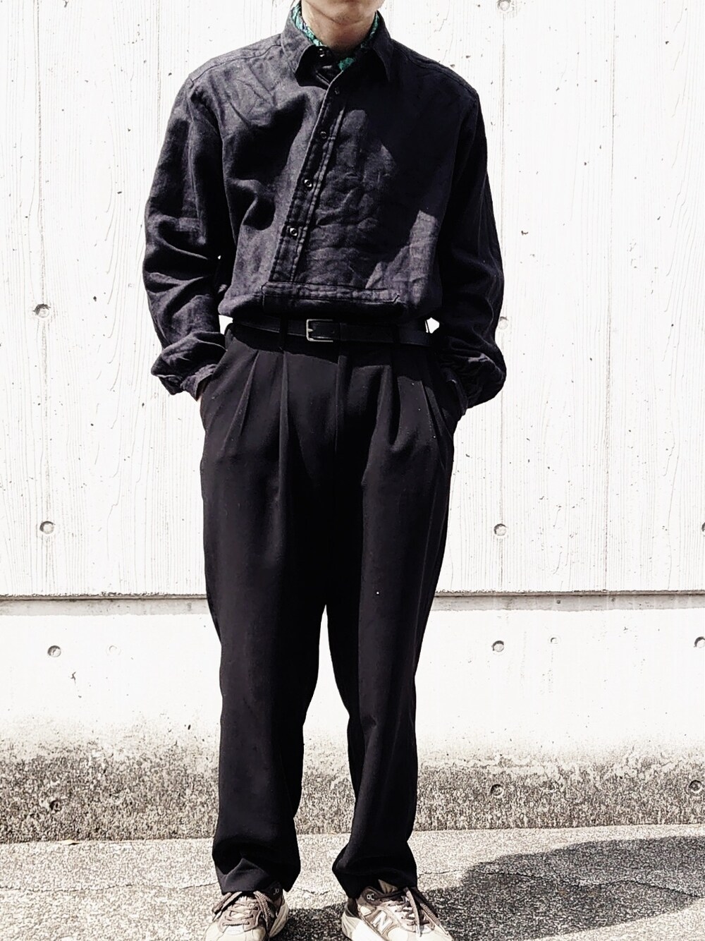 シックなワントーンコーデ 和服から着想を得た前立てが特徴的SOSHIOTSUKIのシャツに発色の良い緑のdiorのスカーフをワンポイト差してシンプルになりすぎないようにしました